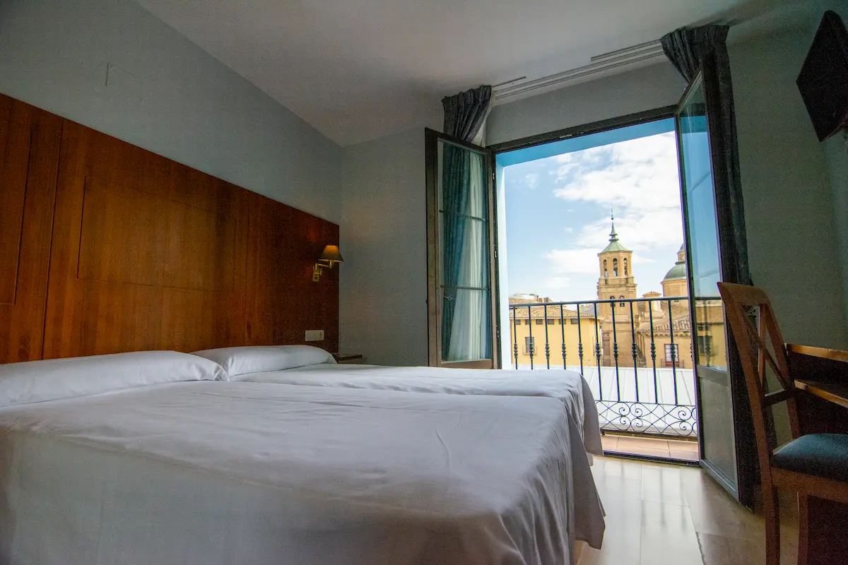 Habitación doble con balcón y vista a edificios históricos bajo un cielo azul con pocas nubes.